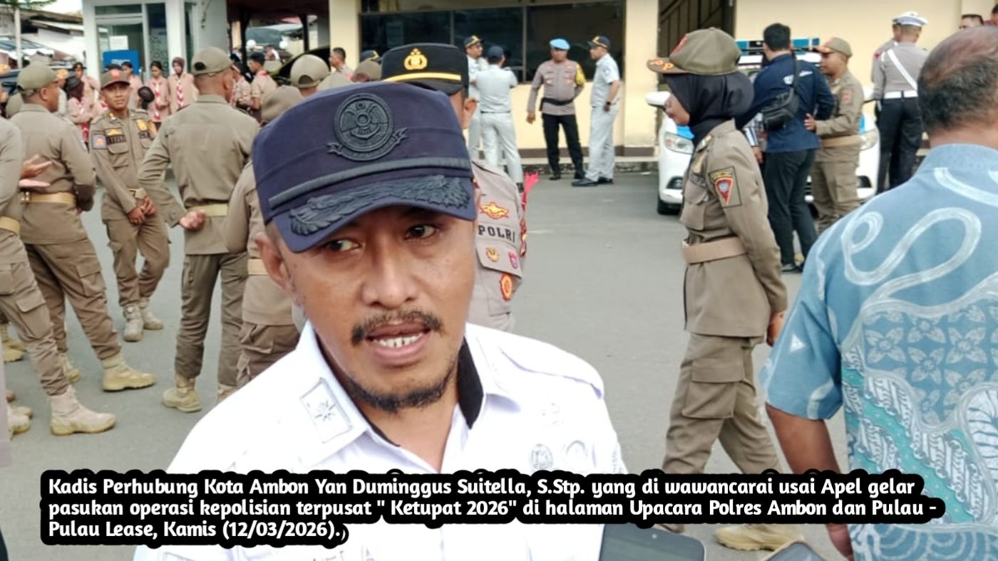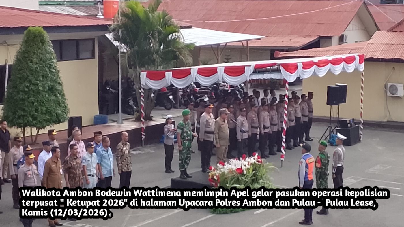 Ambon – Pemerintah Kota Ambon bersama Polri dan TNI menggelar apel pasukan Operasi Ketupat 2026 untuk memastikan pengamanan mudik dan perayaan Idul Fitri 1447 Hijriah berjalan aman dan tertib. Apel digelar di halaman Mapolresta Ambon dan Pulau-Pulau Lease, Kamis (12/3/2026).Apel tersebut dipimpin langsung oleh Wali Kota Ambon, Bodewin Wattimena, yang bertindak sebagai inspektur upacara. Kegiatan...